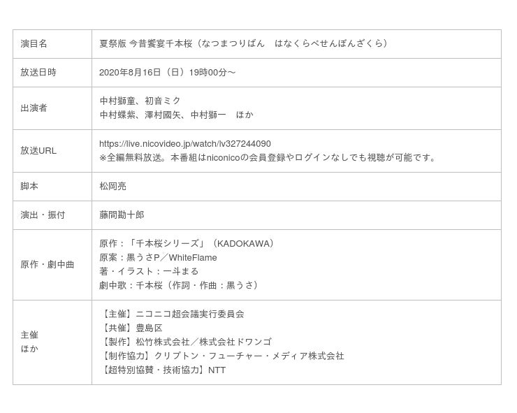 株式会社ドワンゴ(本社:東京都中央区、代表取締役社長:夏野剛)は、日本最大のネットの夏祭り「ニコニコネット超会議2020夏」(開催期間:2020年8月9日~16日)にて、8月16日(日)19時より、超歌舞伎『夏祭版 今昔饗宴千本桜』を全編無料生中継でお届けします。