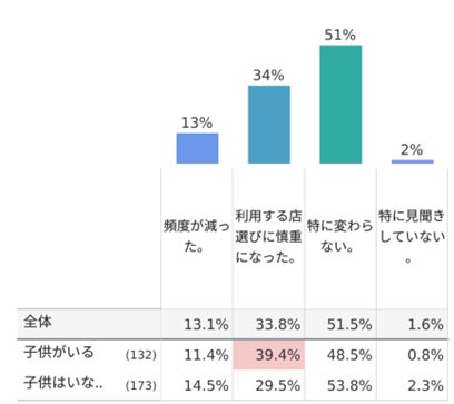 また、同質問に対して「利用する店選びに慎重になった」人は、子どもがいる場合39.4%、子どもがいない場合29.5%と、子どもの有無で約10ポイントの差が出る結果となりました。(「子どもがいない」には未婚者も含む)