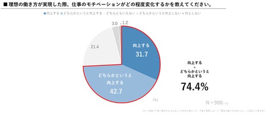 若年社会人の中で、理想の働き方が実現した際に、仕事のモチベーションが高まると回答したのは74.4%。