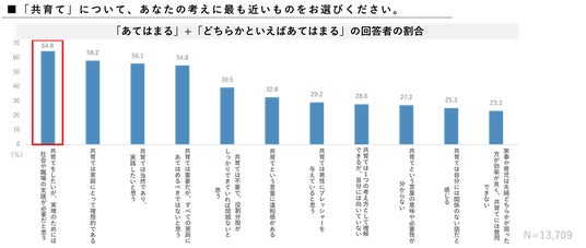 「共育てをしたいが、実現のためには社会や職場の支援が必要だと思う」が最も多く、次いで「共育ては家庭にとって理想的である」、「共育ては当然であり、実践したいと思う」が多い。