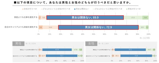 家庭と仕事(キャリア)の優先順位付けについて、約7割が性別は関係ないと回答。