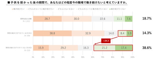 理想の働き方ができていない若年社会人は、理想の働き方ができている若年社会人に比べて、子育て期間における離職意向が24.3ポイント高い。