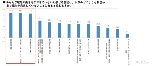 若年社会人が理想の働き方を実現するために求める支援として、上位に「残業時間の抑制」「在宅勤務の活用」「有給休暇取得の促進」が挙がる。