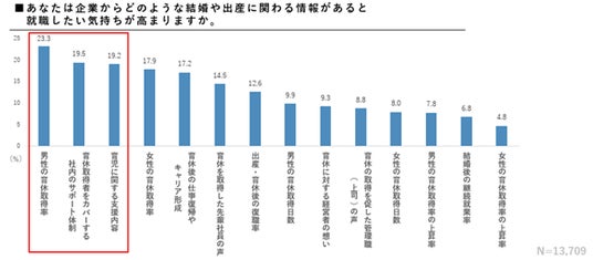 若年層が就活で重視する「結婚や出産に関わる情報」は、「男性の育休取得率」が最も高く、次いで「育休取得者をカバーする社内のサポート体制」「育児に関する支援内容」が多い。