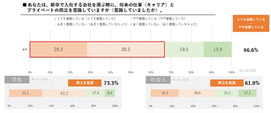 若年層の約7割が、会社を選ぶときに、「仕事(キャリア)とプライベートの両立」を意識している。