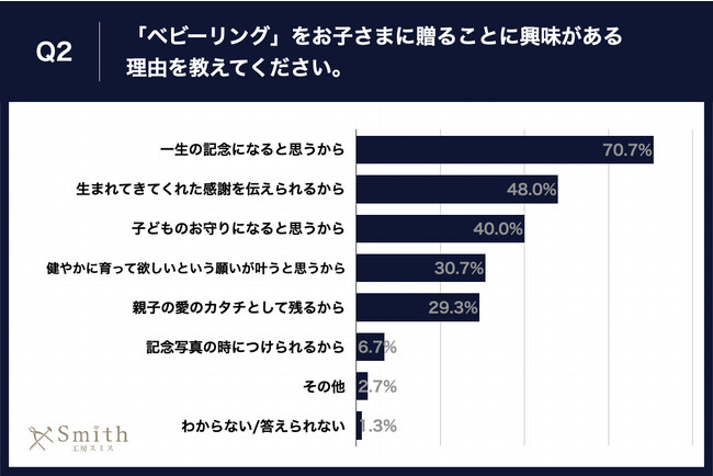 Q1で「非常に興味がある」「やや興味がある」と回答した方に、「Q2.「ベビーリング」をお子さまに贈ることに興味がある理由を教えてください。」(n=75)と質問したところ、「一生の記念になると思うから」が70.7%、「生まれてきてくれた感謝を伝えられるから」が48.0%、「子どものお守りになると思うから」が40.0%という回答となりました。