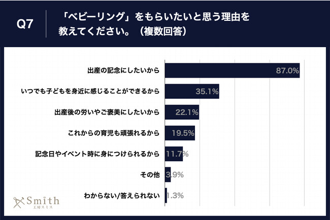 Q6で「非常にそう思う」「ややそう思う」と回答した方に、「Q7.「ベビーリング」をもらいたいと思う理由を教えてください。(複数回答)」(n=77)と質問したところ、「出産の記念にしたいから」が87.0%、「いつでも子どもを身近に感じることができるから」が35.1%、「出産後の労いやご褒美にしたいから」が22.1%という回答となりました。