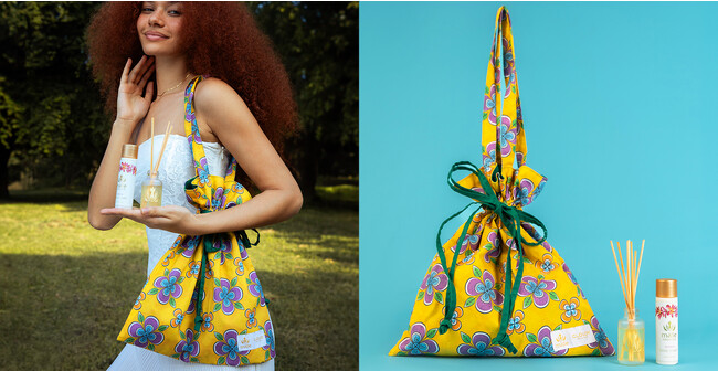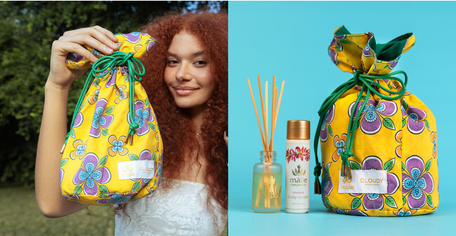 滞在先を居心地の良い空間することにもこだわっている彼女が厳選したMalie Organicsのアイテムを、カラフルなイエローが眩しいCLOUDYのアフリカンテキスタイルの巾着バッグに入れてお届けします。