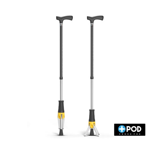 クロスポッド (CrossPOD)は”1点つえ”を、どこでも安定して立てられる様にした製品です。歩行時は1点杖として違和感なく使うことができ、置いておきたい時には、開閉式の脚を開くことで、どこにでも立てられます。杖先端部の脚開閉ユニットは小型、軽量(つえ総重量360g)で、開閉操作も簡単です。