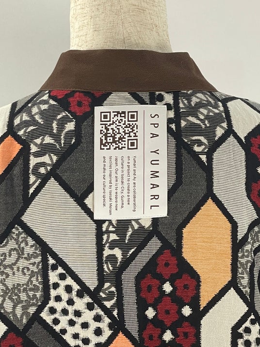 首後ろにはQRコードを用いたオリジナルタグが。QRコードから専用ウェブサイトへ飛び、ゆまーる銘仙柄ユニフォームが誕生した背景をご覧いただけます。