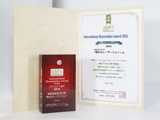 噴水レーザーショー「ヴェルサイユの光」がテクノロジー部門で単独で優秀賞を受賞、最高到達点150m、日本一の高さを誇る三位一体のパフォーマンスが評価されました。