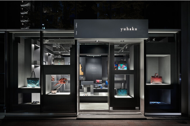 2020年12月17日、銀座にオープンしたyuhakuの旗艦店。yuhaku製品のほか、代表 仲垣友博によるレザーアートや、書家 杉田廣貴氏とのコラボアイテムなど、革のアート性を追求した作品を多数展示販売する。