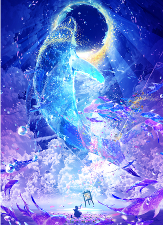 みずみずしい海の生き物たちが自由に空を泳ぐ幻想世界をどこまでも広がる希望の象徴として想像力豊かに描く。