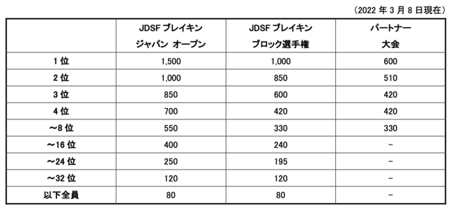 拝啓 公益社団法人日本ダンススポーツ連盟 ブレイクダンス本部(以下 JDSF) は、2019年12月に国際オリンピック委員会(以下、IOC)により発表された、新種目であるダンススポーツ競技 ブレイキン種目の日本国内における統一組織です。2019年より全日本ブレイキン選手権(以下、全日本)をスタートし、2020年から強化選手の採用を開始しました。2021年度は10名の選手が日本を代表するブレイキンの強化選手として活動をしています。2022年度より強化選手を決定するための重要な大会である全日本ブレイキン選手権へのロードマップを刷新し、従来のJDSFブレイキンブロック選手権での出場枠の決定ではなく、JDSF主催大会とパートナー大会から得られるポイントでの国内ランキングを設定し、ランキングの順位に応じて全日本出場枠が付与されるロードマップへ変更します。JDSF主催大会とパートナー大会の詳細は下記をご確認ください。 敬具