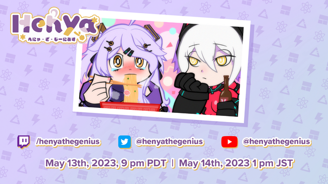 「Henya(へにゃ)」のデビュー配信は日本時間の2023年5月14日(日)13:00より、彼女のTwitchチャンネル(https://www.twitch.tv/HenyaTheGenius )にて放送されます。