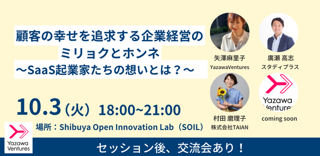 シード 特化のベンチャーキャピタルであるYazawa Ventures(本社:東京都渋谷区 代表取締役:矢澤 麻里子 以下:当社)は、SaaSの経営に興味がある方やライフサイクルに関わる事業領域に興味のある方向けに「顧客の幸せを追求する企業経営のミリョクとホンネ ~SaaS起業家たちの想いとは?~」を開催することをお知らせいたします。