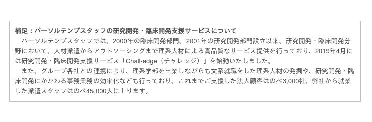 博士人材の活躍の場が大学などの教育・研究機関以外にも求められていることから、JREC-IN Portal において、パーソルテンプスタッフは、研究人材求人情報の掲載を通じた連携をおこなってきましたが、このほど、JREC-IN Portal が新しく開発した研究人材へのスカウト機能の利用を通じ、新たな連携を開始します。
