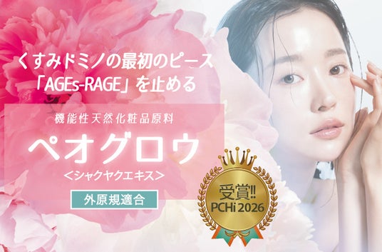 「ペオグロウ」は、ボタン科のシャクヤクの根から得られるエキスで、抗菌、抗酸化、消臭、美白、抗糖化作用のほか、黄ぐすみ・茶ぐすみ・グレーくすみの起源となりうるAGEs受容体(RAGE)へのAGEsの結合を阻害し、肌の見た目向上が期待されます。