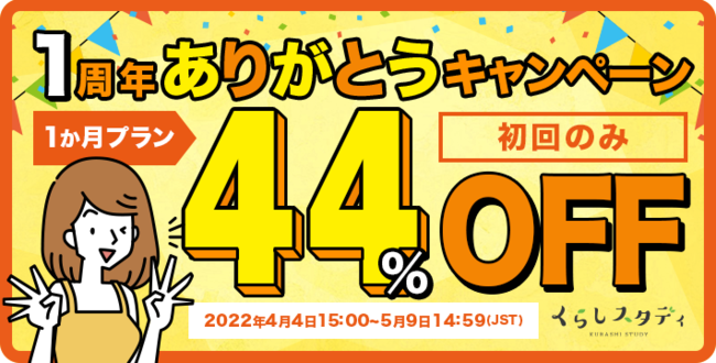 アプリ「くらしスタディ」の有料プランに初めて加入する方を対象として、サブスクリプション「1か月プラン」を44%オフで提供します。