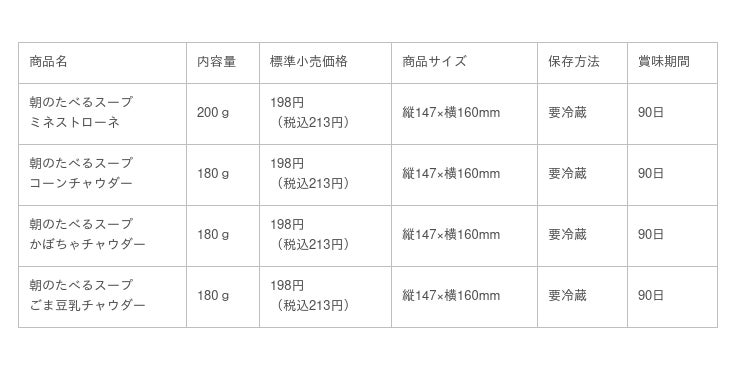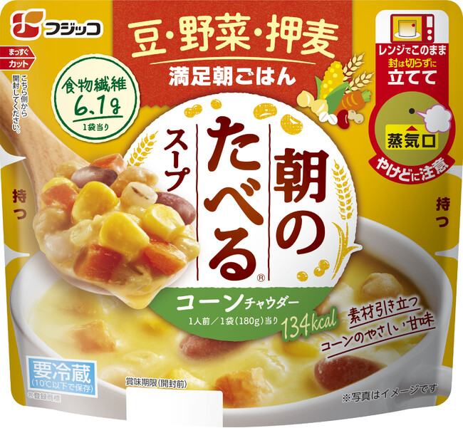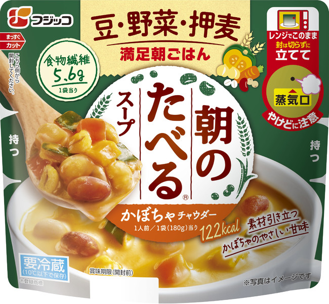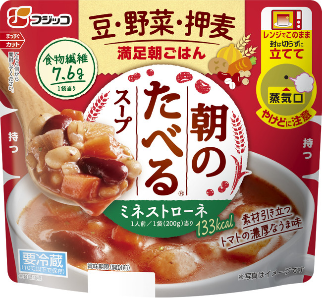 「朝のたべるスープ」シリーズは、豆・野菜・押麦が入った多品目を特長とする、たべることにこだわったスープです。また、袋のままレンジで温めるだけの手軽さもポイント(500W-2分~2分半:アイテムにより異なる。)で、少しでも時間を節約したい朝、調理負担を軽減し、素早く簡単に、栄養バランスの良い、おいしい朝食をお召し上がりいただけます。