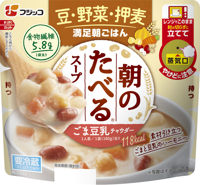 フジッコ株式会社(本社:神戸市中央区/代表取締役社長執行役員:福井正一)は、豆・野菜・押麦が入った多品目具だくさんスープ「朝のたべるスープ」の新商品として「ごま豆乳チャウダー」を9月1日(木)より新発売いたします。さらに、シリーズ全品を、食物繊維が豊富な仕様にリニューアルします。