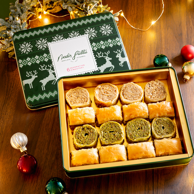 ウインターモチーフをあしらったナーディル・ギュル オリジナル缶に4種類のバクラヴァをアソートしました。