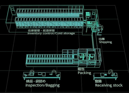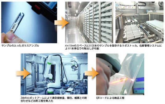 今回納入した自動化システムは、従来手作業であったサンプルのデータ登録・在庫管理、サンプルの入庫・保存・出荷業務の自動化を担っています。メインとなる低温自動保管庫「ラボストッカ」は、最大51万本のサンプルを4℃の環境下で安定保存。サンプルは1本ずつデータ管理されており、外部からの要求に応じ、ラボストッカが必要なサンプルのみをピッキング・出庫しています。このラボストッカに加え、前後工程の入庫、梱包、検品、封入(発送用)工程を含めた自動化ラインとなっています。