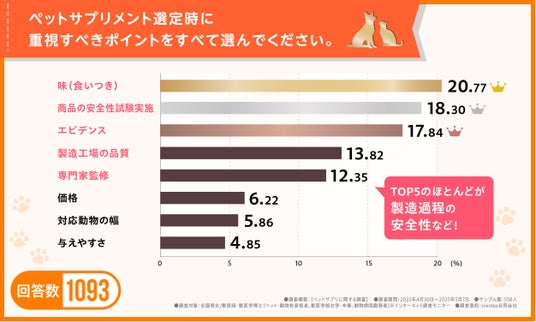 ペットサプリメントを選定する際に重視すべきポイントとして最も多かったのは「味(食いつき)」(20.77%)で、次いで「商品の安全性試験実施」(18.30%)、「エビデンス」(17.84%)と続きました。製造工場の品質(13.82%)や専門家監修(12.35%)も上位にランクインしており、「安全性」に関わる要素が重視されていることが分かります。