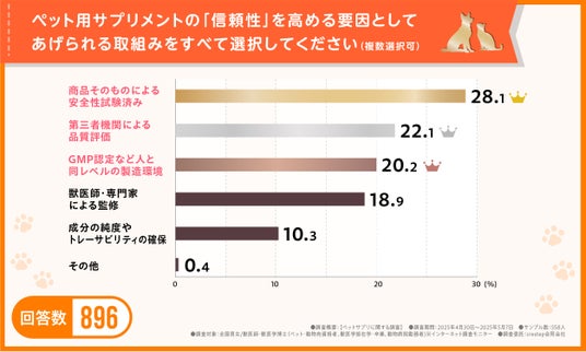 ペット用サプリメントの「信頼性を高める要因」として最も多かったのは「商品そのものによる安全性試験済み」(28.1%)。次いで「第三者機関による品質評価」(22.1%)や「GMP認定など人と同レベルの製造環境」(20.2%)が続きました。獣医師・専門家の監修(18.9%)も重視されており、信頼性確保のために科学的根拠や品質保証が求められている実態が明らかになりました。