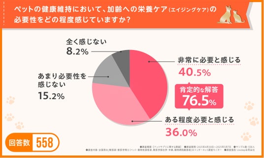 「ペットの健康維持において、加齢への栄養ケア(エイジングケア)の必要性をどの程度感じていますか?」という質問に対し、「非常に必要と感じる」(40.5%)、「ある程度必要と感じる」(36.0%)と回答した人は合計76.5%に上り、多くの飼い主が高齢ペットに対する栄養管理の必要性を実感していることが分かりました。