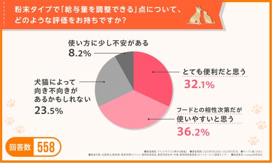 「粉末タイプで『給与量を調整できる』点について、どのような評価をお持ちですか?」という質問では、「とても便利だと思う」(32.1%)、「フードとの相性次第だが使いやすいと思う」(36.2%)と回答。使い方への不安や向き不向きの意見もある一方で、調整可能な形状への利便性を評価する声が目立ちました。