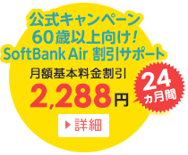 申込日時点で満60歳以上のお客さまが、受付期間中に新たにSoftBank AirをAirターミナル5購入でお申し込みいただき、適用条件を満たしていただけた場合、課金開始月より24ヵ月間、月額料金より2,288円を割引いたします。