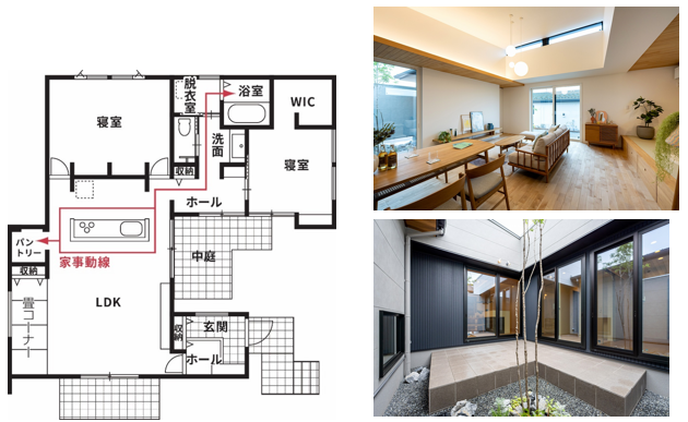 生活の特徴としては、プライベート空間が魅力の中庭を採用。LDK、ホール、玄関で囲まれた中庭のためカーテンレスな生活が可能に。さらに、LDKと隣接していることで、お天気の良い日は家族でランチやカフェを楽しむこともできるなど、日々の生活に彩を与えてくれます。