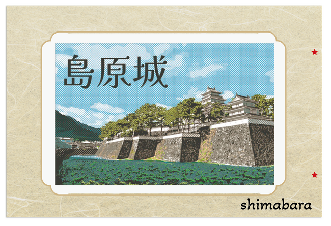 島原城築城400年を翌年に控え、島原の観光を楽しんで巡ることができる新しい企画を4月25日(火)より開催します。島原城と鯉の泳ぐまちの5箇所に設置してあるスタンプを重ね捺すと、島原城と石垣が最も美しく見える場所から描いた絵画のような図柄が完成します。島原城と四明荘に入館・入場の際に渡される記念ポストカードの裏面が専用のスタンプ台紙となっています。