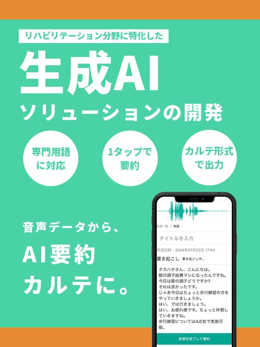 株式会社Pleapが提供する診療支援ツール「medimo」は、医療従事者と患者の会話からAIがカルテ原稿を自動生成するシステムです。このたび、リハビリテーション分野に特化した生成AIソリューションの共同開発を開始しました。グループ関連病院である彩都リハビリテーション病院および川西リハビリテーション病院を検証場として、カルテ作成時間の短縮、業務負担の軽減、記入漏れの削減を目指します。これにより、リハビリテーション現場の効率化を図り、医療従事者の負担を軽減し、患者さまへの質の高い医療の提供を実現することを期待しています。