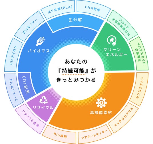 「バイオマス」コーナーでは、有機合成、重合、ウレタン合成用の最新のバイオマスモノマーを紹介します。また、ポリウレタン合成用のポリオールについては、バイオマス由来だけでなく、CO2を直接利用したサステナブルなカーボネートジオールも提案します。更に、バイオマスポリマーについては、トウモロコシ由来の生分解性樹脂ポリ乳酸(PLA)に加え、海洋分解性樹脂のPHAについて複数社のラインナップを紹介します。カトラリーなどに向く硬質系のPHBVをはじめ、シートにも応用可能な軟質系のP3HB-4HBまで、ハイケムだからできる幅広い提案が可能です。