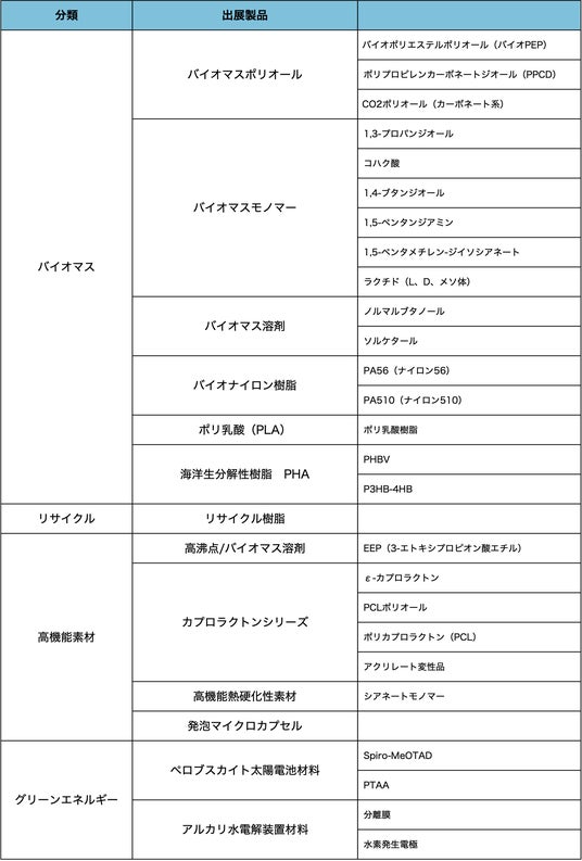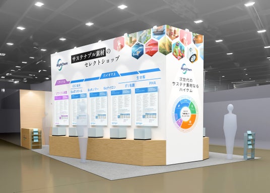 今回の出展では、昨年に引き続き、最新のバイオマスモノマーやポリオール、ポリ乳酸(PLA)やバイオナイロンなどのバイオマスポリマーに加え、中国メーカーの販売代理店契約を今年新たに締結した高機能素材などを展示します。また、ペロブスカイト太陽電池や水素エネルギーなどのグリーンエネルギーに向けた部材も紹介するなど、ハイケムが取り扱うサステナブル素材を集結させました。