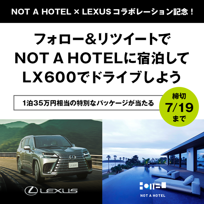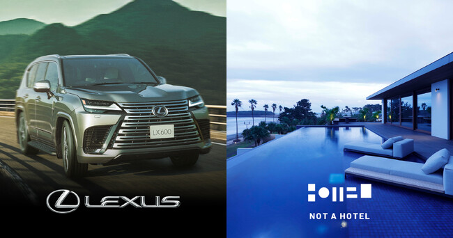 NOT A HOTEL株式会社(東京都渋谷区、代表取締役CEO:濱渦伸次、以下「NOT A HOTEL」)は、LEXUSと期間限定でコラボレーションし、NOT A HOTEL AOSHIMAにて滞在中、無料で特別仕様のフラッグシップSUV「LX600」をご利用いただけるエクスクルーシブパッケージを提供開始いたします。