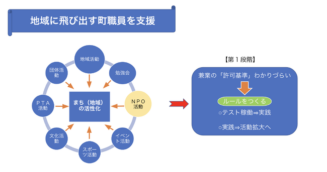 住民のニーズが高度複雑化し、各種サービスに要求される専門性も高くなっているため地域活動団体(NPO等)の需要も増している。そこで行政法規や諸手続き等に精通し、専門的知識のある町職員が参加することで、活動団体の活性化に寄与することが見込まれる。また活動団体と職員間で信頼関係が深まることで、人脈も形成され、本業である職務遂行にもプラスに働き、行政と住民との協働が推進されることが期待される。