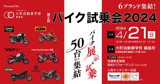 佐賀県の大町自動車学校グループ(所在地:佐賀県杵島郡大町町、代表取締役:鶴田英司、以下 大町自動車学校)は、バイク文化の促進と安全運転意識の向上を目指し、昨年大好評を博した「特別バイク試乗会&安全運転講習会2024」を、2024年4月21日(日)に佐賀市鍋島にて開催いたします。今年は新たに美味しいグルメキッチンカーも登場いたします。バイク愛好家はもちろん、休日のお出かけイベントとしても楽しめる場として、たくさんの方々のご来場をお待ちしております。