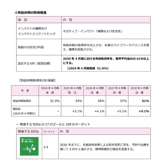 当社は、「いままでも、これからも、みなさまと長くお付き合いができるように」三本の柱を掲げ、SDGs達成に向けて取り組んでまいりました。本取り組みにあたり、ペーパーレス化、女性社員の雇用割合の増加・障がい者雇用の促進、エコで長く住み続けられる住宅の推進・住宅性能の向上、有給休暇の取得推進につながるKPIを設定し、継続的なモニタリングが実施されます。