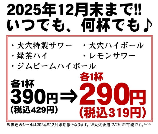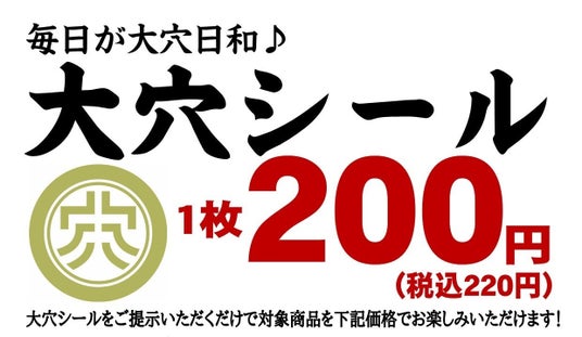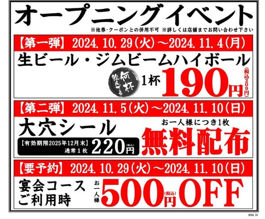 1.第一弾10月29日(火)~11月4日(月)迄生ビール・ジムビームハイボール 1杯190円(杯数無制限)2.第二弾11月5日(火)~11月10日(日)迄大穴シール無料配布(通常200円 税込220円のところ)