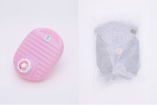 日本製の小型湯たんぽとセット。シンプルなパッケージ。