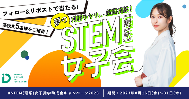 公益財団法人山田進太郎D&I財団は、夏から秋にかけて、2023年7月6日に募集を開始したSTEM(理系)女子奨学助成金をより多くの生徒や教員、保護者の皆さまに周知することを目的に『STEM(理系)女子奨学助成金キャンペーン2023』を展開します。このたび、第一弾として、現役東京大学医学部生でクイズ番組等でご活躍されている河野ゆかり様とのコラボレーション企画「河野ゆかりさんへ進路相談!夢のSTEM(理系)女子会」キャンペーンを、8月16日から31日まで実施します。キャンペーンにご応募いただいた高校生のなかから抽選で5名様を、9月16日に実施する河野様とのクローズド座談会に招待します。