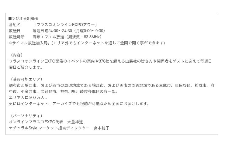 オンラインフラスコEXPOを運営する合同会社スマートルーチェ(東京都渋谷区)は認知拡大を目的にオリジナルのラジオ番組「フラスコオンラインEXPOアワー」を2023年1月1日からスタートします。オリジナルのラジオ番組は初の試みで毎月行われるEXPOのご案内や370社を超える出展社の紹介を行います。パーソナリティはオンラインフラスコEXPO代表の大重雄進とナチュラルStyle.マーケット担当ディレクターの宮本総子が担当します。