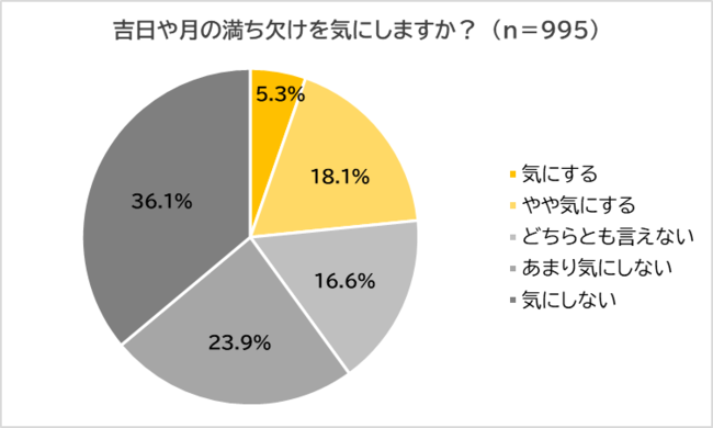 「吉日や月の満ち欠けを気にするか?」と聞いたところ、「気にしない」(36.1%)が最多となり、以下「あまり気にしない」(23.9%)、「やや気にする」(18.1%)、「どちらとも言えない」(16.6%)、「気にする」(5.3%)となりました。
