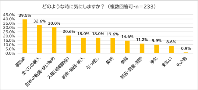 続いて「どのような時に気にするか?」聞いたところ、最多は「事始め」(39.5%)、「宝くじの購入」(32.6%)、「財布の新調・使い始め」(30.0%)、「入籍(婚姻関係)」(20.6%)、「納車・納品・納入」「引っ越し」(共に18.0%)と続きました。何かを始めるにあたり、縁起を担ぐことを意識している人も多いようです。