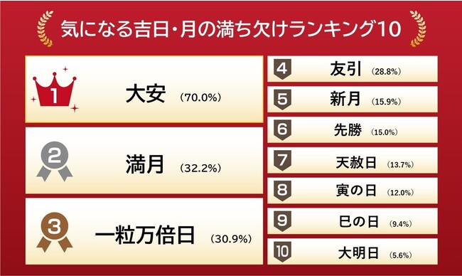 「気にする」「やや気にする」と回答した233人に「どの吉日や月の満ち欠けが気になるか?」と聞きました、圧倒的1位は「大安」(70.0%)で、2位「満月」(32.2%)、3位「一粒万倍日(いちりゅうまんばいび)」(30.9%)、4位「友引」(28.8%)、5位「新月」(15.9%)でした。六曜はカレンダーや手帳などにも記載があり、中でも「大安」は認知度も高いので、気になる人が多いようです。「一粒万倍日」も宝くじ売り場などで「本日は一粒万倍日」と書いてあるポスターやのぼりなどを目にすることも多く、3割の人気になると回答しました。また、「天赦日(てんしゃにち)」「寅の日」「巳の日(みのひ)」は、メディアなどでも耳にするようになりましたが、認知度は低く、あまり浸透していないことがわかりました。