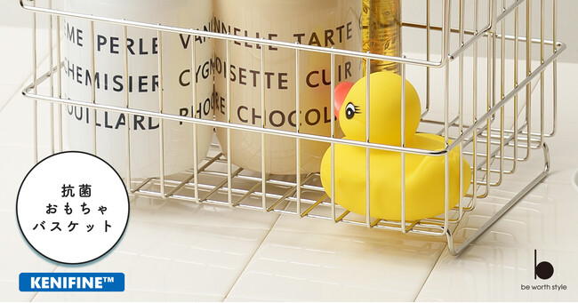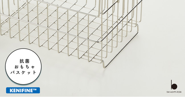 バスケット本体に抗菌めっき「KENIFINE」を施した「抗菌おもちゃバスケット」は水周りでも安心です。湿気の多いお風呂場でも長く綺麗にお使いいただけます。