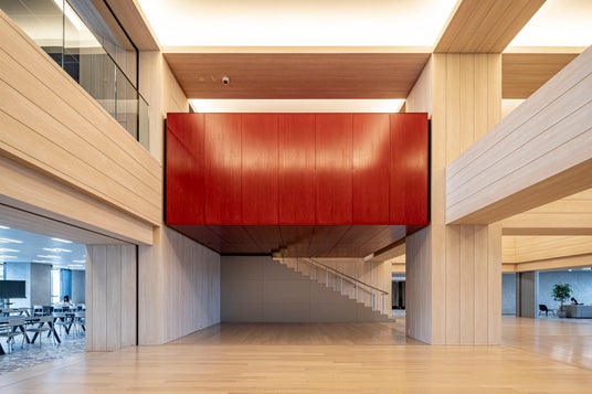 「漆不燃材」を採用した商業施設:漆不燃材が吹き抜けの大空間を彩る。